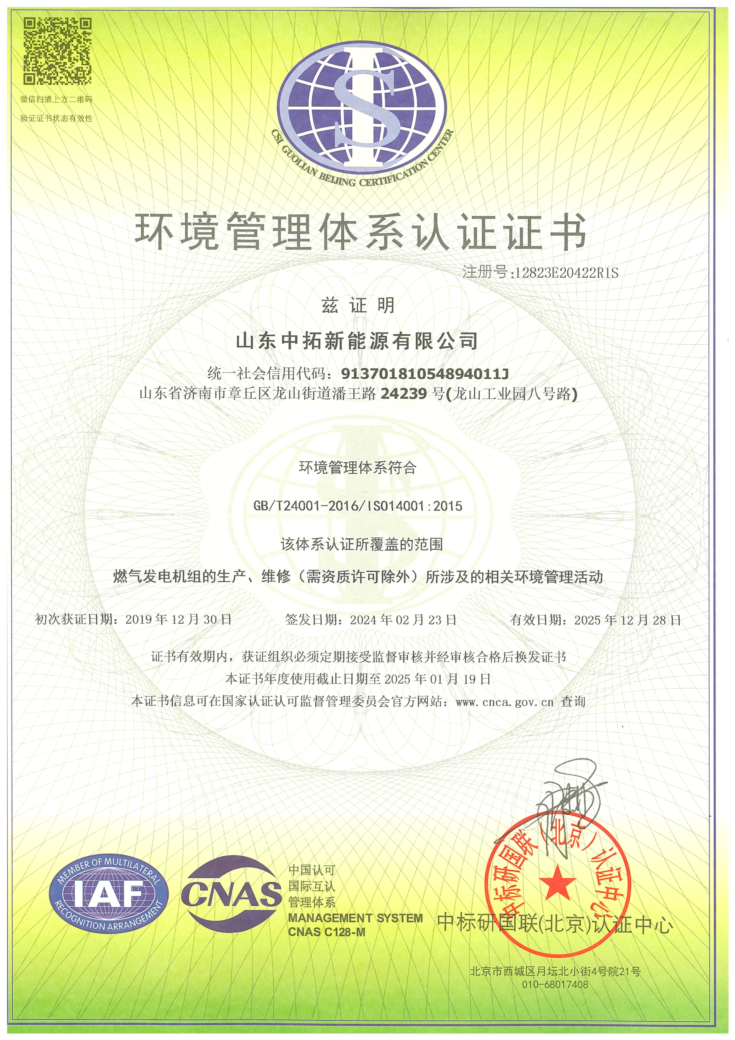 環境管理體系認證證書